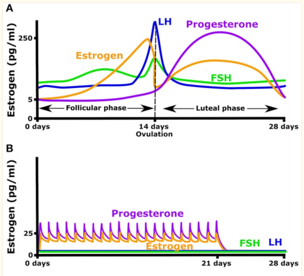 the hormones involved in the menstrual cycle change in a sophisticated dance to allow ovulation and menstruation. we will assume a generalised cycle where ovulation is happening for simplicity here, but there is so much variation between bodies. day 0 is the first day that you bleed, and the start of the hormonal cycle.